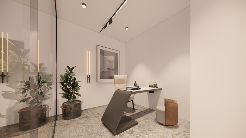 Navigating the challenge of space constraints with finesse, we seamlessly integrated essential areas such as the waiting lounge, conference room, manager's office, assistant manager's office, and even a compact yet inviting toilet facility. But we didn't stop there – nestled within the interstitial spaces, a smart coffee bar/kitchenette awaits, offering a refreshing respite for both mind and body.